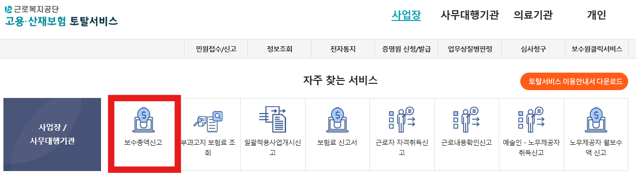 1) 근로복지공단 고용·산재보험 토탈서비스 로그인(사업장)