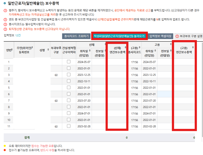4) 아래 화면과 같이 (산재) 연간보수총액, (고용) 연간보수총액에 금액을 입력해 줍니다. 그러나 엑셀파일로 업로드하여 작성하고 싶은 분들은 아래 화면에 [작성파일(일반근로자(일반예술인))불러오기]를 클릭하여 파일 업로드를 해줍니다.