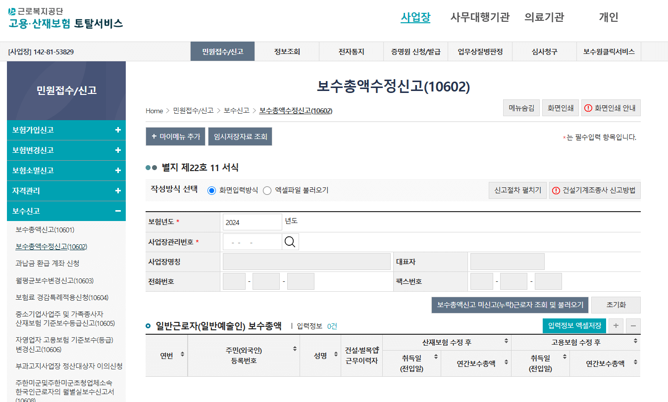 - 민원접수/신고 > 보수신고 > 보수총액수정신고(10602)로 들어가서