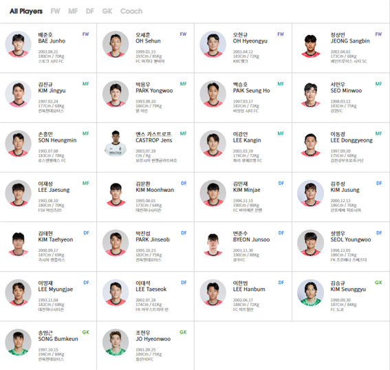 MF | 이강인, 이동경, 옌스 카스트로프 | 중원 전개·창의성 |
